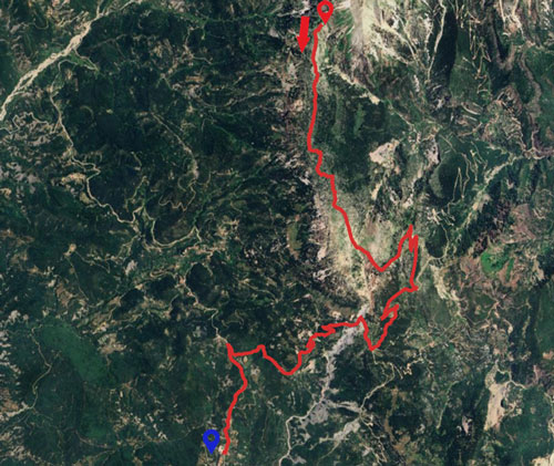 Η διαδρομή ξεκινά από τους πρόποδες της κορυφής 'Καλόγερος' και με νότια κατεύθυνση περνάμε από την ευθεία κορυφογραμμή προς Φούρκα. Απότομη κατάβαση για 2.5 χιλιόμετρα, και περνάμε από το μνημείο του Κατσαντώνη, κοντά στην σπηλιά που τον έπιασαν. Κατηφορίσουμε μέσα από τα έλατα προς Αι Γιώργη & Καρνέικα, για να βγούμε στην δημοσία προς Βούλπη.